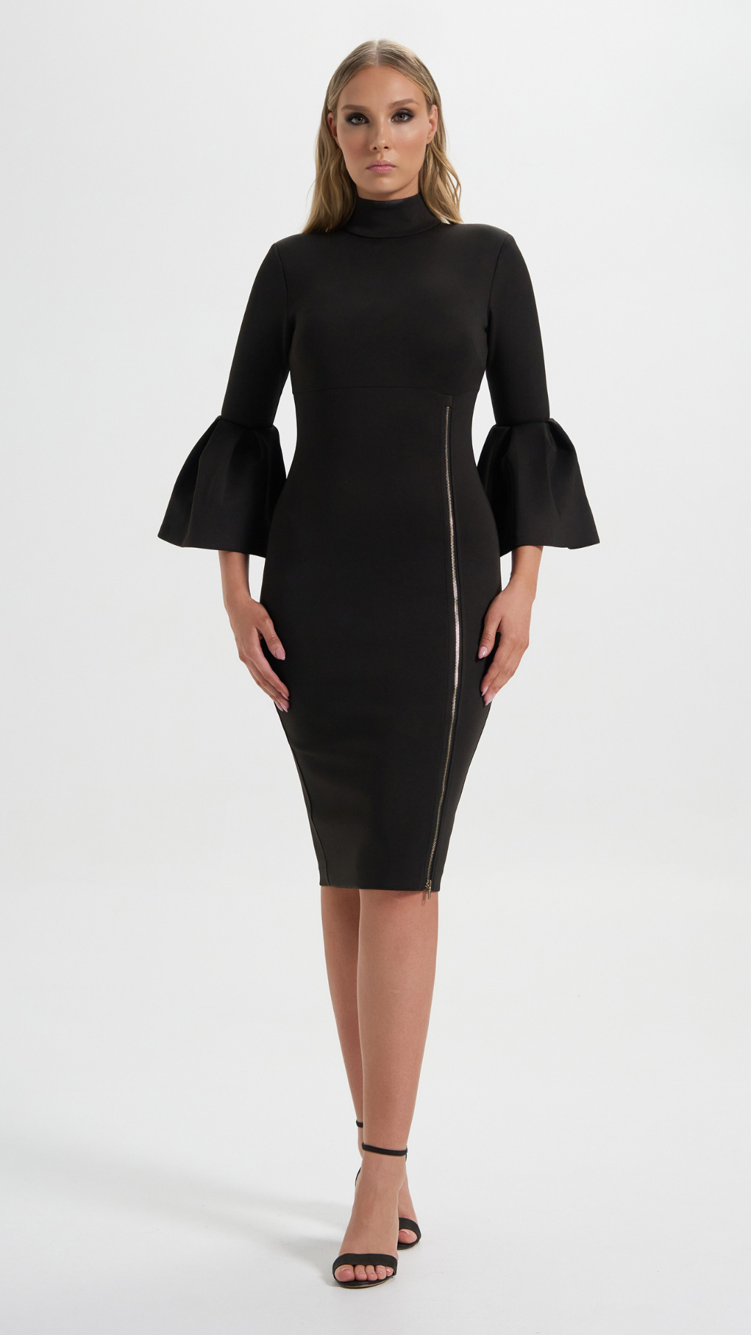 A bold sculptured silouette dress. The kind of presence that doesnt enter quietly. Its made for the woman who leads with intent, in a boardroom, in stride, in vision. It doesnt just fit, it sharpens, it empowers & asserts. Designed with miltary funcional zippers in front, structured tailored peplum, a precision mandarin collar, sleeves with ruffled cuffs, and the golden back walk in zipper. Its the dress that states power has arrived , sit up , take note and stay impressed.